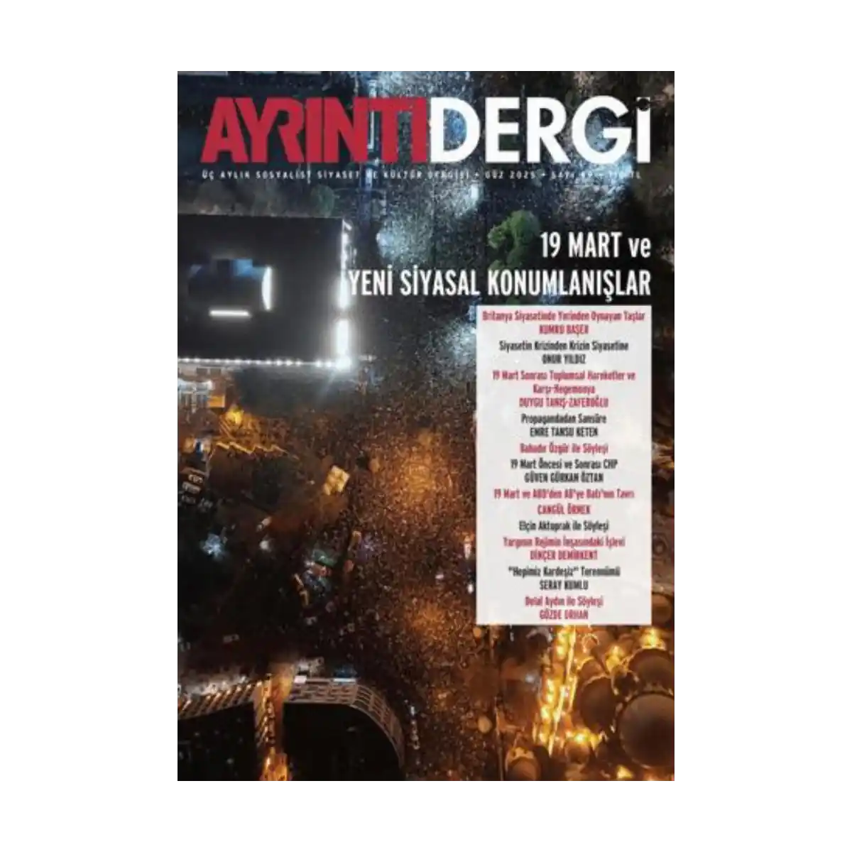 Ayrıntı Dergi’nin 49. Sayısı 19 Mart sonrası süreçlere odaklanıyor. Derginin gündem bölümünde Kumru Başer’in İngiltere’de yeni bir sol siyasi oluşumu incelediği yazısı var. Makale Jeremy Corbyn ve Zarah Sultana’nın öncülüğünde kurulan şaşırtıcı derecede yoğun bir ilgiyle karşılaşan, çok kısa süre içinde içeride sarsıntı yaşayan Your Party’e ilişkin ilk değerlendirmeler ve öngörüleri içeriyor. Dosya bölümü Onur Yıldız’ın CHP’nin içine düşürüldüğü krize karşı izlediği politikanın dönüşümünü vurguladığı, bu niteliksel dönüşümün sadece kadro değişimi değil, krize ilişkin siyasal bir yanıt verme girişimi olduğunu ileri süren çalışması ile başlıyor. Duygu Tanış – Zaferoğlu, biraz da geriye giderek toplumsal hareket literatürü içinden ele aldığı 19 Mart sonrası hareketliliğin karşı–hegemonya oluşturucu nitelikte olup olmadığın sorguluyor. Emre Tansu Keten “Propagandadan Sansüre: 19 Mart’ın Medya ve İletişim Stratejisi” başlıklı yazısında AKP’nin iletişim stratejisinin genel işleyişini ve özel olarak iktidarın İmamoğlu kampanyasının üzerine inşa edildiği stratejiyi analiz ediyor.