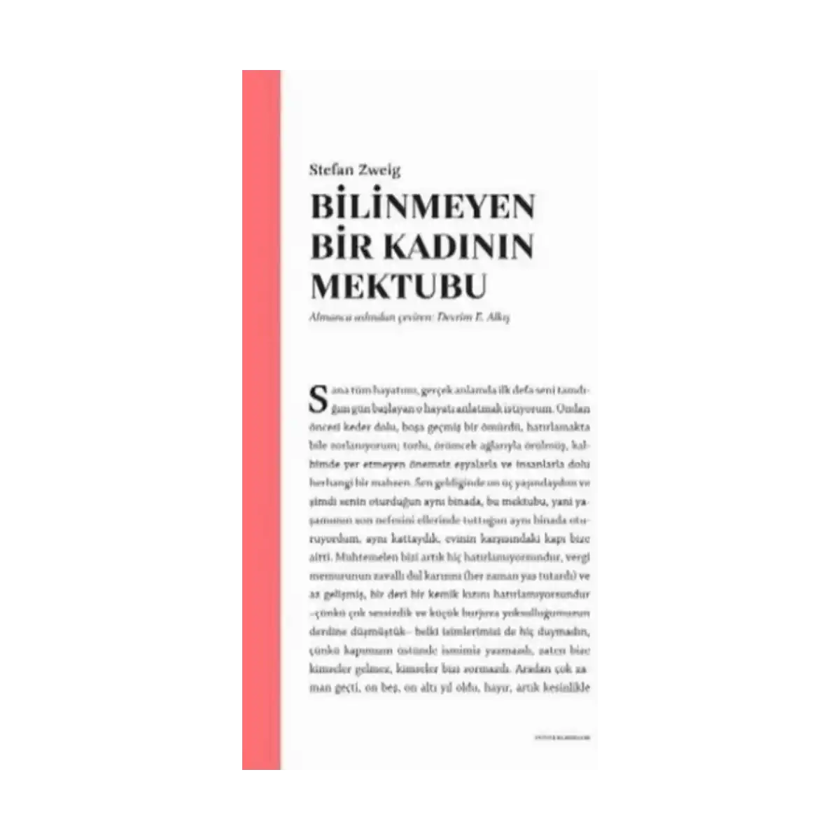 Bir adam, bir kadın, bir mektup. Stefan Zweig, mektup biçiminde yazdığı bu etkileyici eserinde bir kadının yaşamı boyunca tek bir adama duyduğu platonik aşkın psikolojisini, kadının iç dünyasından hareketle çözümleyerek mutlak aşkı sorgulatıyor.