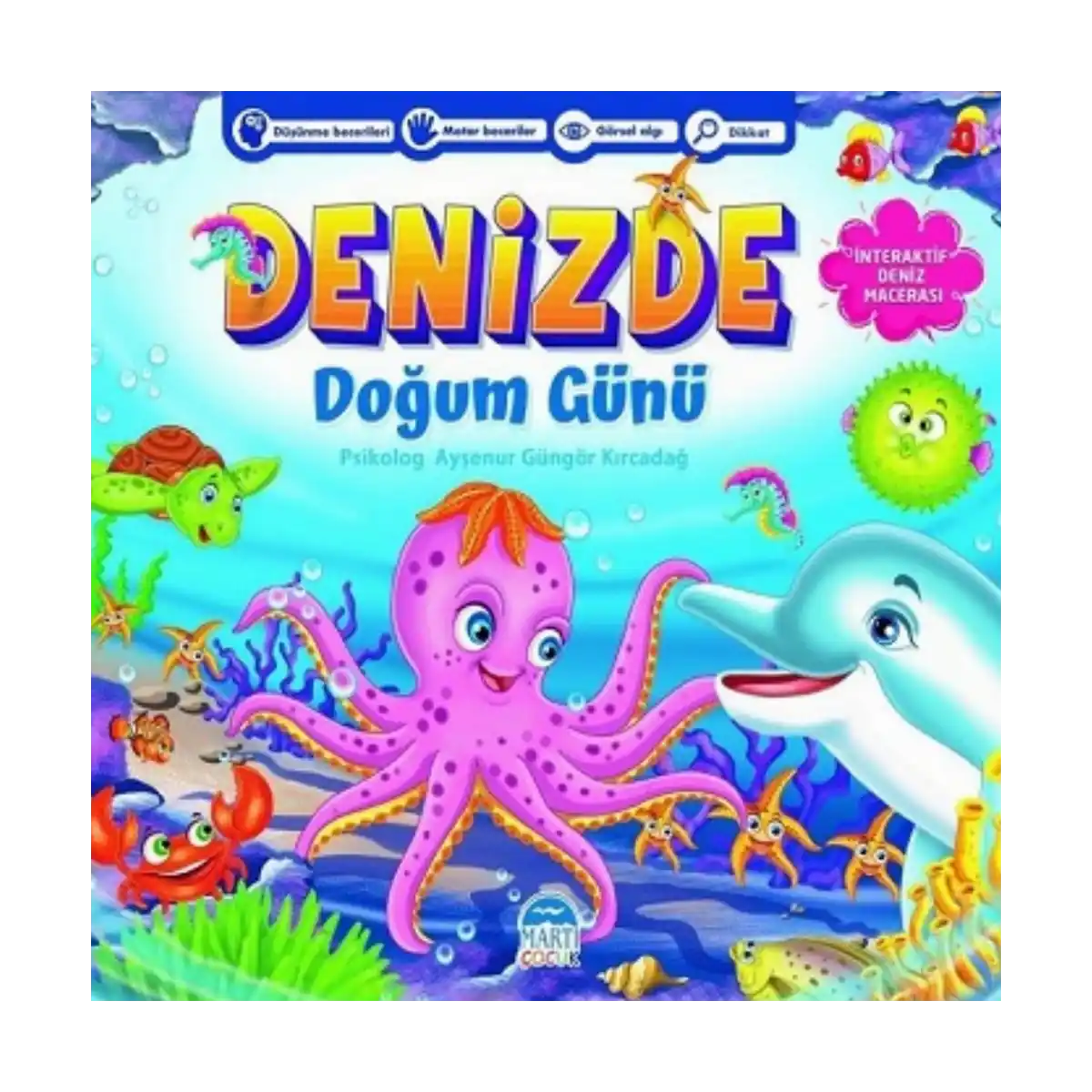 Denizde Doğum Günü kitabı çocukların deniz canlılarını tanımaları amacıyla hazırlanmıştır. Kitabın iç kapağında topluca yer alan hayvanları sayfalardaki yerlerine yerleştiren çocuklar görsel öğrenme yaparak bilgilerini pekiştireceklerdir. Yeniden kullanılacak şekilde hazırlanan hayvan resimleri sayesinde kitabı birden fazla kez kullanabileceksiniz.