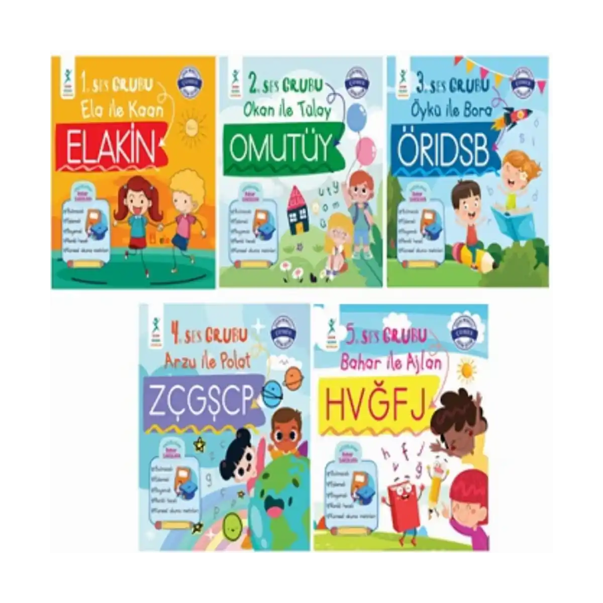 Okumaya Başlıyorum Ses Grupları Seti: 1. Ses Grubu Ela ile Kaan ELAKİN 2. Ses Grubu Okan ile Tülay OMUTÜY 3. Ses Grubu Öykü ile Bora ÖRIDSB 4. Ses Grubu Arzu ile Polat ZÇGŞCP 5. Ses Grubu Bahar ile Ajlan HVĞFJ İlk okuma-yazma sürecinde sesler, gruplar hâlinde öğretilmektedir. ELAKİN, OMUTÜY, ÖRIDSB, ZÇGŞCP ve HVĞFJ harf sırasına uygun olarak hazırlanmış kitaplarımız; karesel (hızlı okuma) metinler, eşleme, boyama ve çizme çalışmalarıyla da desteklenerek çocukların okumalarını geliştirmeleri ve okuma-yazmayı daha hızlı çözmeleri adına hazırlanmıştır. Bulmacalı Eşlemeli Boyamalı Renkli heceli Karesel okuma metinleri