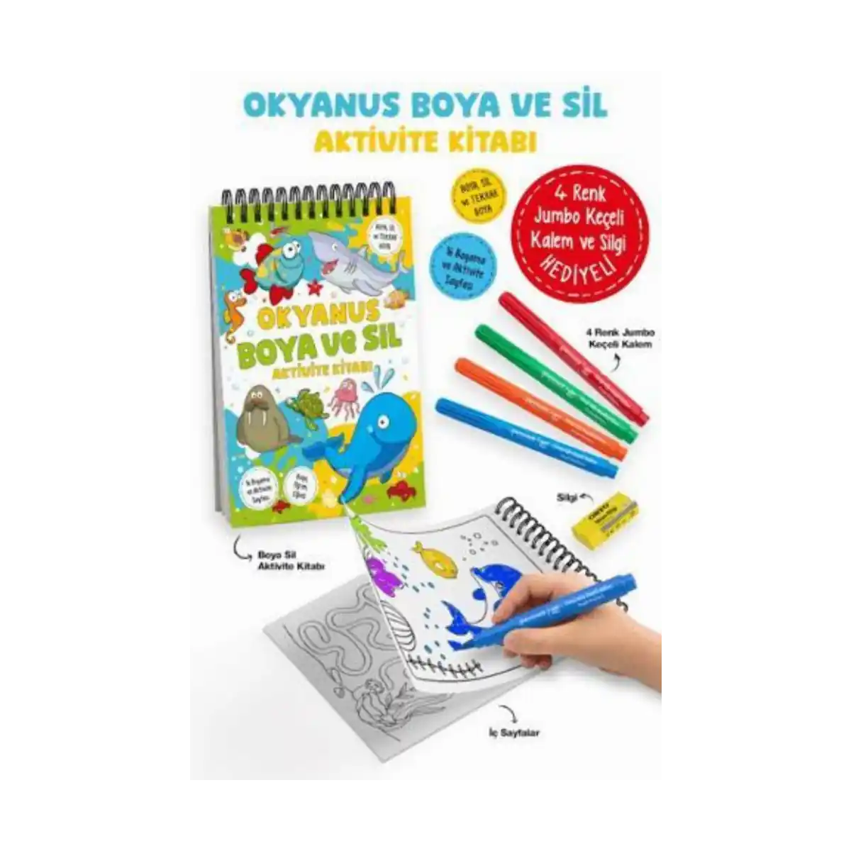 4 RENK JUMBO KEÇELİ KALEM ve SİLGİ HEDİYE!Boya, Sil ve Tekrar BoyaOkyanusun gizemli derinliklerine doğru heyecan dolu bir keşfe çık!Keyifli etkinliklerle öğrenirken eğlen.Dört farklı renkteki keçeli kalemlerle resimleri dilediğin gibi boya, sil ve tekrar boya!- İnce motor becerilerini destekler.- El-göz koordinasyonunu güçlendirir.- Görsel algı ve şekil tanımayı pekiştirir.- Örüntü ve eşleştirme yetilerini artırır.- Matematiksel becerileri geliştirir.